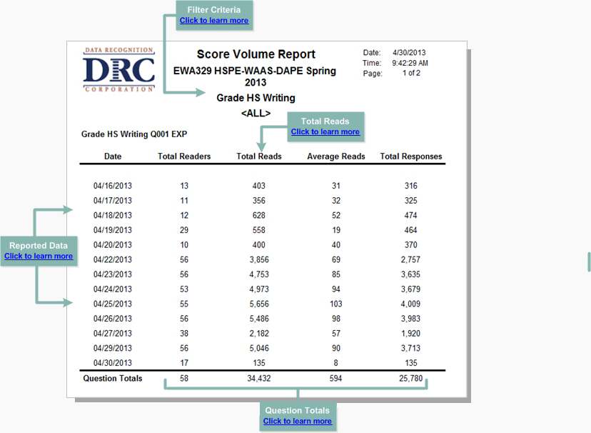 PAS personnel use the Score Volume report to track the volume of instances scored by readers on a daily or cumulative basis. Only instances read to a complete status are included on the report. Click the links below to learn more about the Score Volume report and its components.